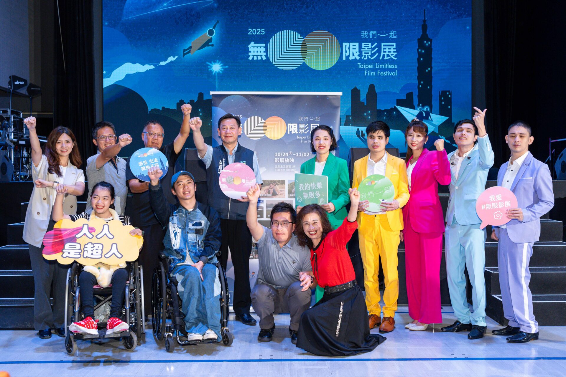 《2025無限影展》開幕式大合照、有臺北市政府勞動局副局長梁蒼淇(第二排左四)《台灣超人》導演曲全立(第二排左三)與主角「競速甜心」姚宥米(第一排左一)及其父親姚宗元(第二排左二)跨界無限大使《哇賽心理學》Podcast主持人心理師Nana(第二排左一)和YouTuber CHAIRMAN 椅人(第一排左二)自閉症藝術家吳起良(第一排右二)與母親林惠玉(第一排右一)及視障樂團 Eye Music (第二排右起)    圖片提供:公視
