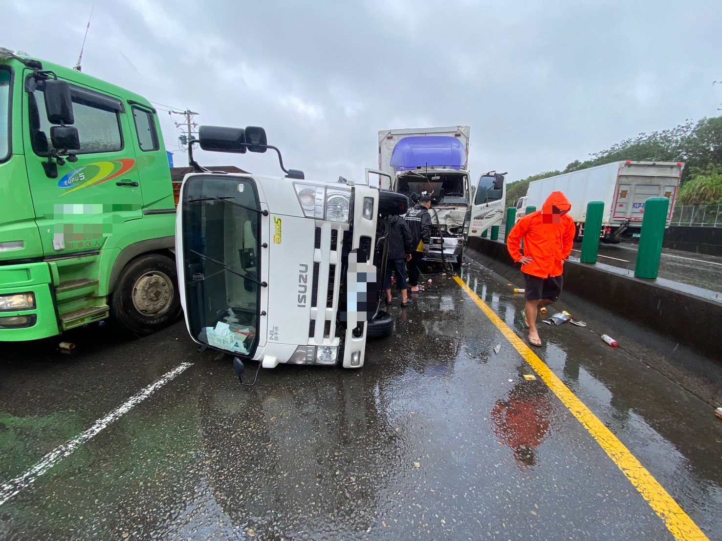 楊梅分局說明,王男疑似因未保持安全車距,故不慎追撞前方砂石車,之後偏移碰撞同向大貨車後翻覆,警方獲報後於現場協助疏導交通,現場除王男受輕傷,沒有其他人員傷亡。
