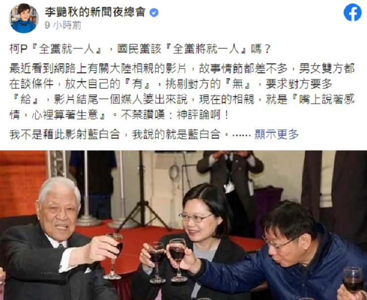 李艷秋批,我們不需要有157的智商也可以看出,就算和柯文哲合拿到政權,以對方台獨的本質、毫無行政能力的表現、反反覆覆的性格以及無法與人共事的事實,絕對是台灣的災難。「相親結束了,沒緣無份別勾勾纏,民主選舉本來就是自作自受,讓選民做決定吧!」