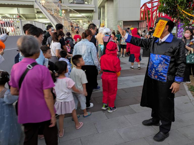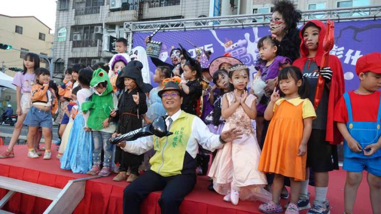 ▲活動最高潮莫過於變裝踩街,林世賢市長一身殭屍打扮,與精心變裝的大小朋友一齊「搞怪」同樂,其樂融融。(圖╱記者孔亮云翻攝)