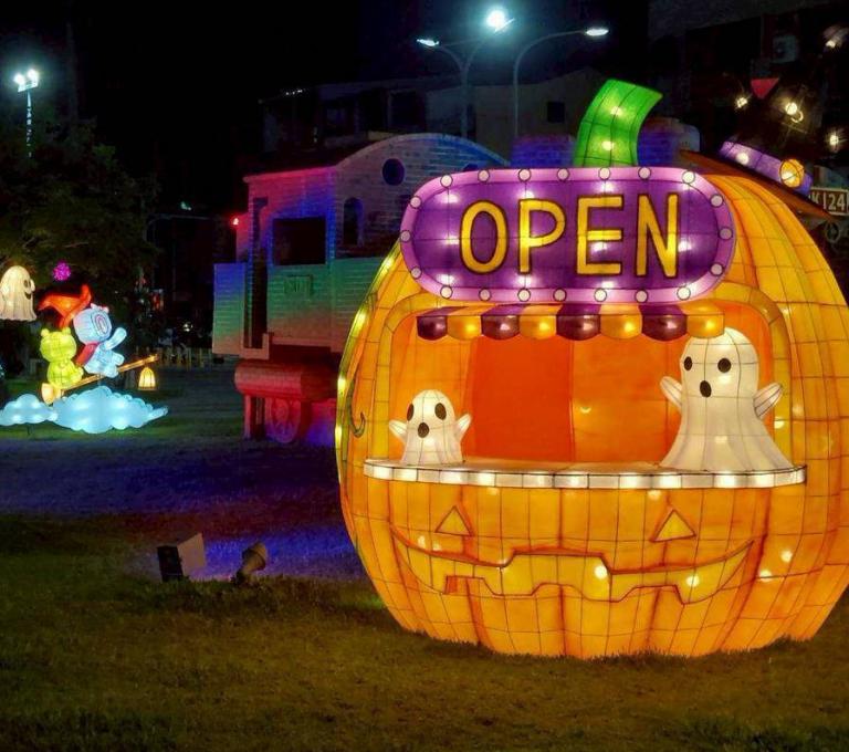隨著夕陽西下,活動現場點亮一座3公尺高南瓜造型售票站燈景矗立眼前,彰化市公所表示,這次配合萬聖節從後站廣場起,沿著扇步道、戶羽機關車園區旁的小公園,再延伸至台鐵舊宿舍沿途佈置的地景燈飾,融入彰化鐵道元素,貫穿彰化後站廣場至臺鐵舊宿舍帶狀廊道區域,美不勝收。