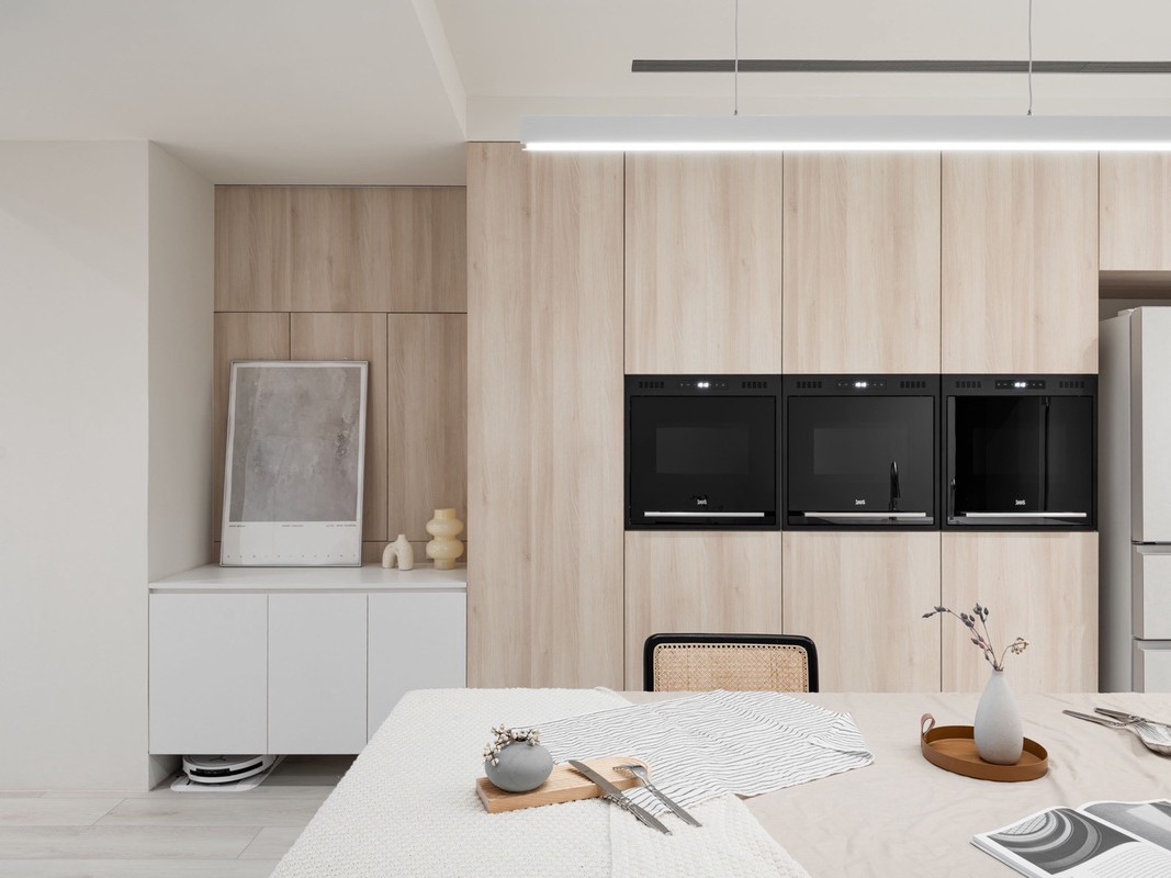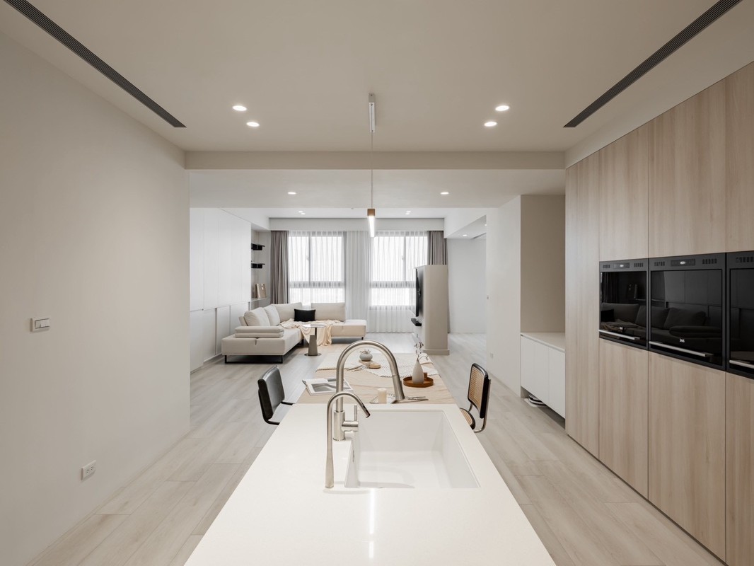 設計師以「簡約、舒適」為核心概念,採用木質地板、淺色家俱與大面窗景,創造自然流暢感。全室導入藝術塗料,使牆面呈現柔和肌理,在日光灑落時形成細緻光影變化,為空間注入溫度與層次。北歐色調與自然質材的結合,讓大坪數不再只是寬敞感,更具生活表情。