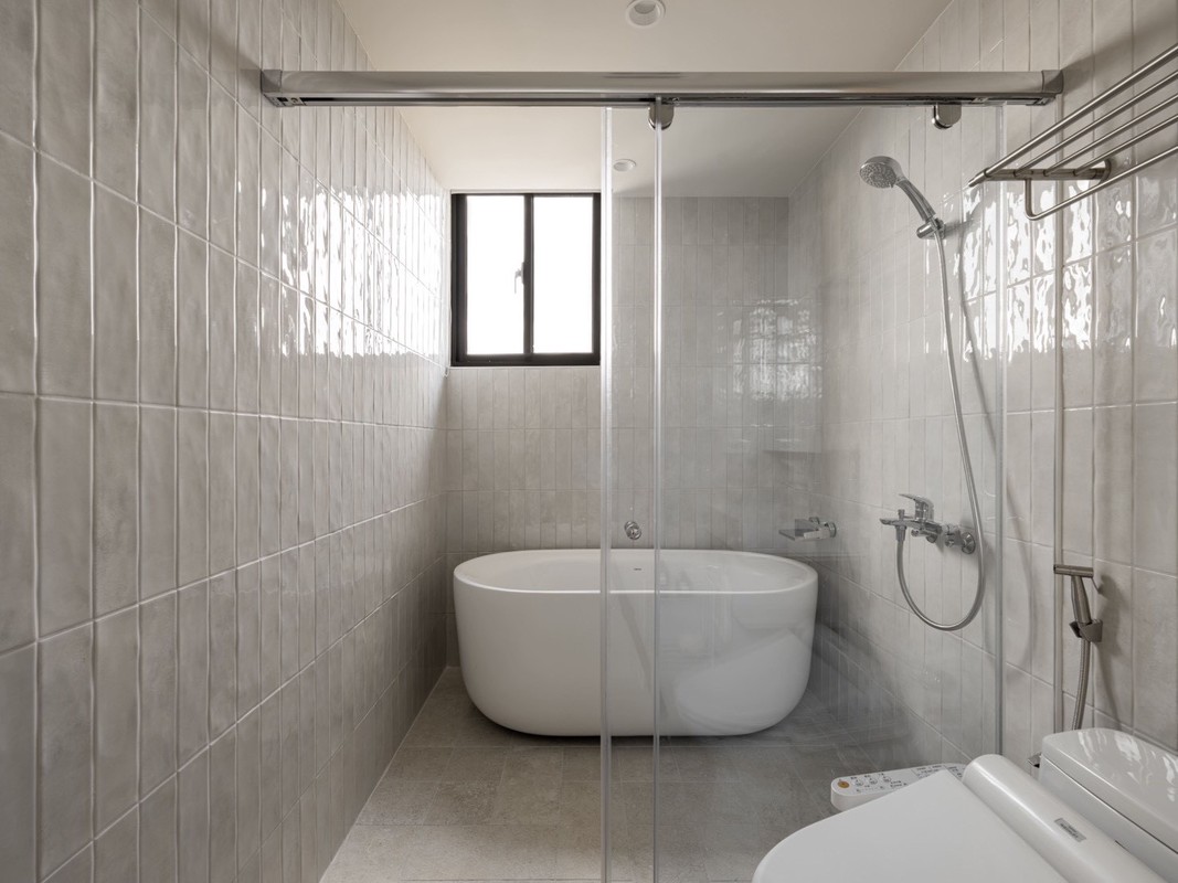 本案為4+1房2廳3衛配置,以灰、白、棕為主色調,設計師在保留大坪數優勢的前提下,重新規劃動線與房間配置。將原始格局中的零碎空間整合,納入書房與客房機能,滿足不同家庭成員的生活需求。浴室區域同步調整尺度,不僅提升使用便利,也讓空間層次更為俐落開闊。