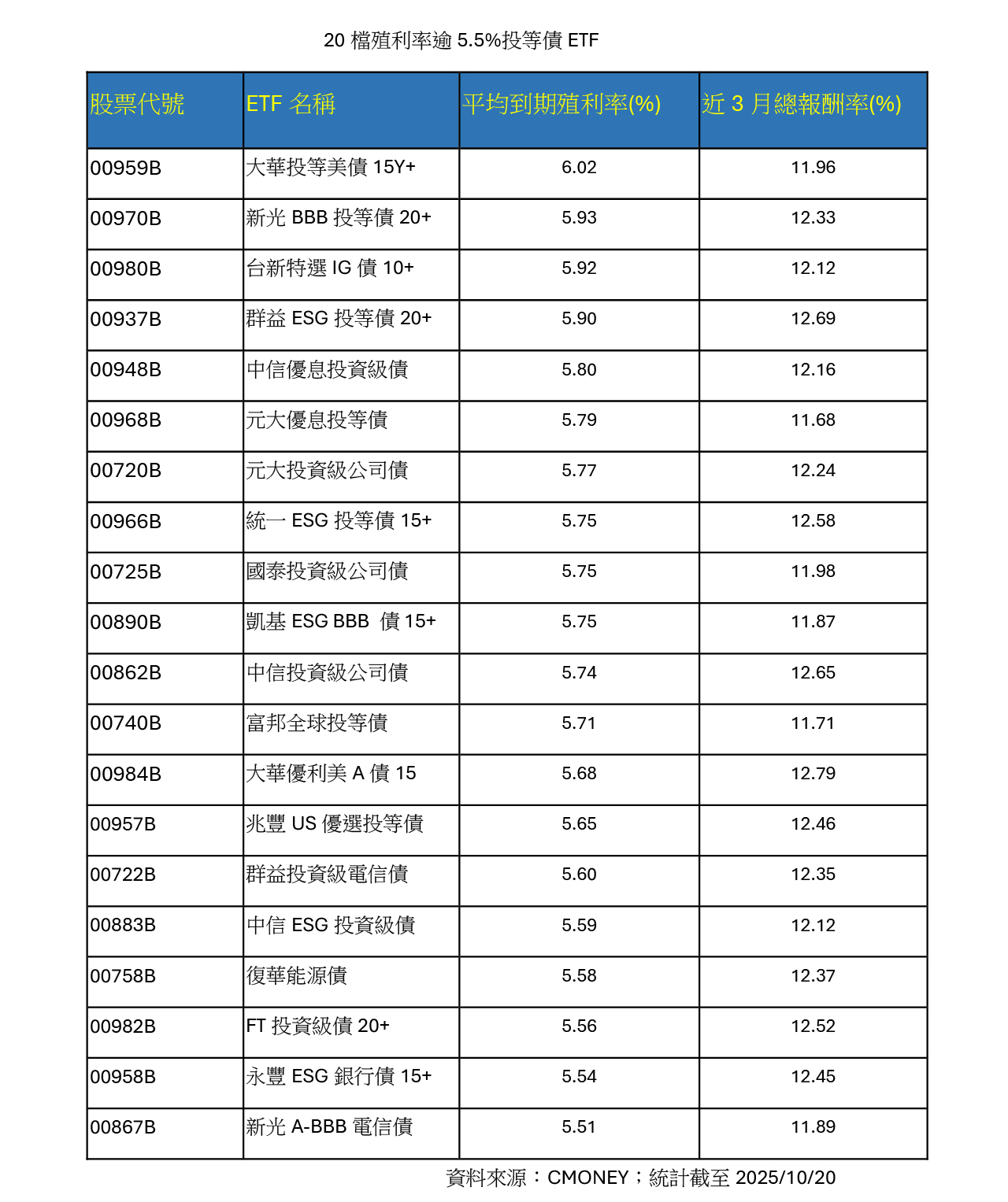 觀察56檔投資等級債ETF最新殖利率表現,根據CMONEY統計至10月20日,殖利率在5.5%以上的共有20檔,(00959B)大華投等美債15Y+是唯一超過6%的。