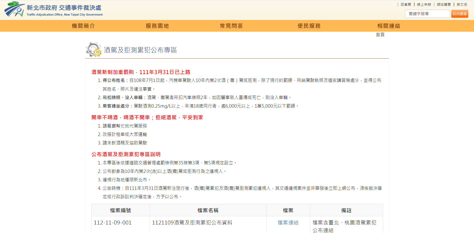 新北市:https://www.tad.ntpc.gov.tw/Drunk_Drivers.aspx