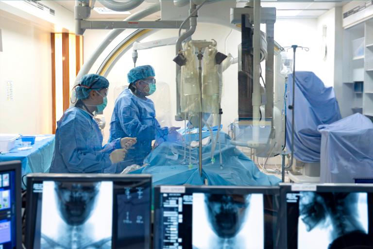 ▲彰基取栓團隊正在導管室中執行緊急手術,與時間賽跑搶救急性腦出血患者,力求迅速取栓,提升病人康復機會。(圖╱彰基提供)