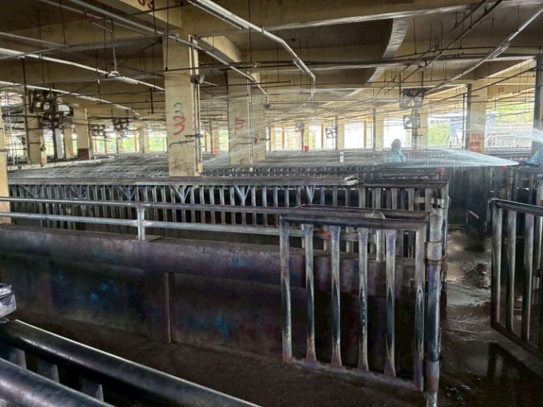 清消作業針對屠宰區域、廢棄物儲放處、車輛出入口、廚餘收集與處理設施等高風險點,消毒藥劑進行高壓清洗與全面噴灑,防疫所人員並現場指導業者正確消毒方式及作業流程,提升自主防疫能量。