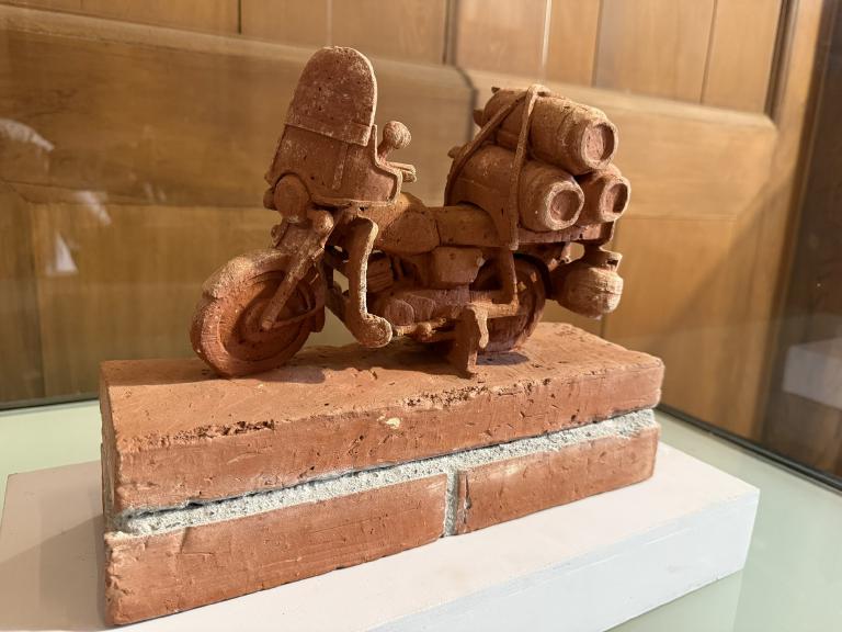 ▲林世富老師將傳統建築裝飾工藝之一的「磚雕」運用於藝術展現,結合雕塑技法與個人美學思維,展現紅磚作為創作媒材的可塑性與藝術深度。(圖╱彰化縣政府提供)