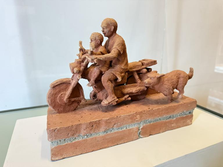 這次展出作品的創作題材都來自林老師的成長時期,從農村田園到童年遊戲與街坊互動,作品透過「窯前雕」技法,先於磚坯上雕刻後在入窯燒製,以樸實的造型語言捕捉常民生命的韌性與溫度,紅磚的溫潤色澤、細緻紋理與窯火痕跡,交織出充滿歷史厚度的畫面,描繪那段社會轉型、經濟起飛的年代,讓觀眾在欣賞作品之餘,也能感受紅磚背後所承載的文化底蘊與生命故事。