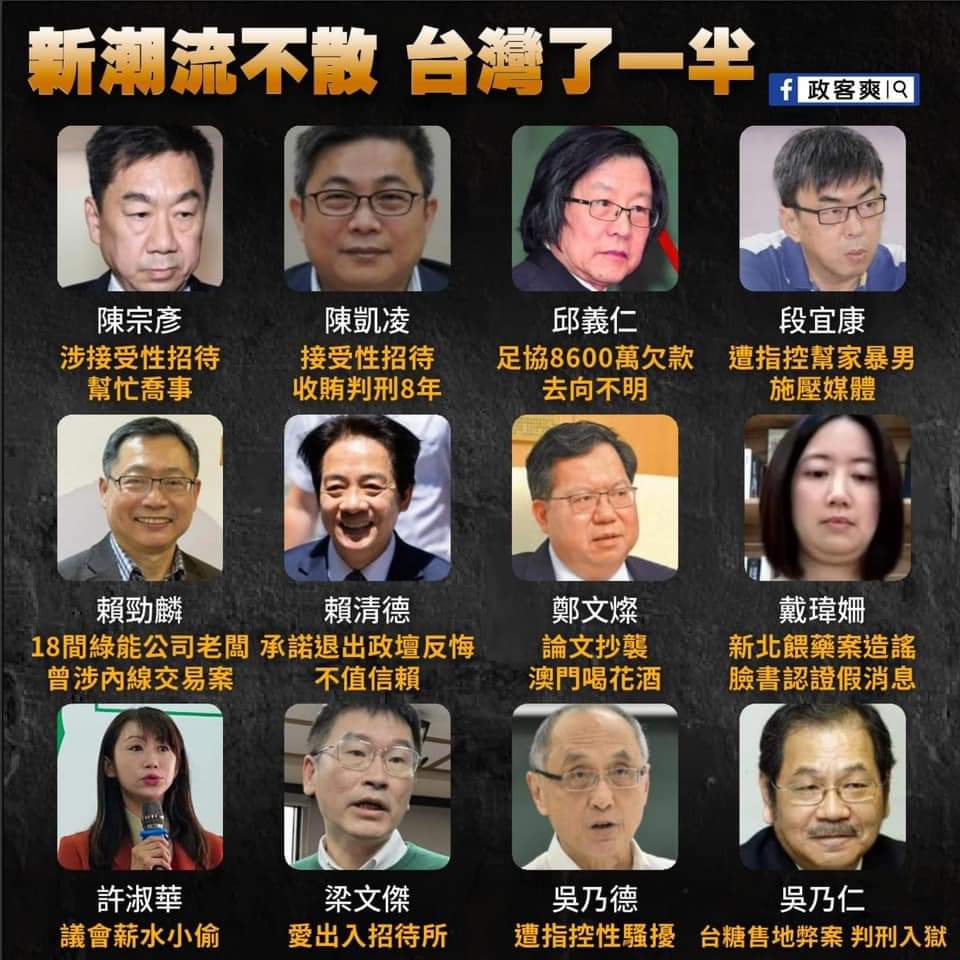 新黨立委參選人游智彬爆料民進黨組織推廣部主任林正鴻頻繁出入風月場所!國民黨北市議員徐巧芯今(10日)痛批民進黨,「白天一本正經,晚上摸乳念經,難道已經成為新潮流的日常了嗎?」,徐巧芯也同時公布一民進黨從政人員名單,包括陸委會副主委梁文傑、林正鴻、台南市府經發局前局長陳凱凌、行政院前發言人陳宗彥、總統府前發言人丁允恭等人均上榜,「新潮流到底有多亂」?