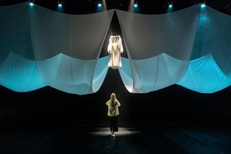 ▲《壵》以「移動戲台」為概念,將山水穿在身上,並運用2塊7公尺乘方的大布幔變化,塑形陽間與陰間、君權與平民、自然與人心。(圖╱歌劇院提供)