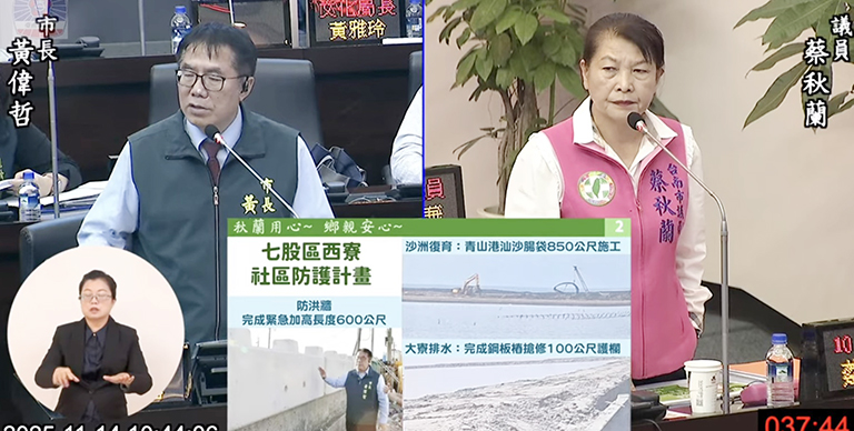 ▲中央全額補助1,2億元補救網仔寮沙洲破口及青山港沙洲堤岸下陷,蔡秋蘭要求水利局在明年颱風季前完工。(圖/南市議會)