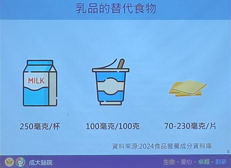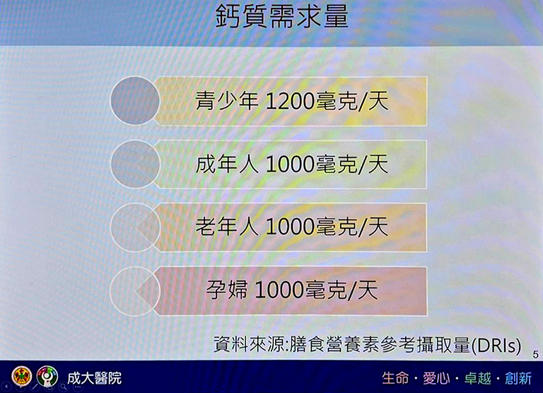 成大醫院營養部黃薇營養師說明,鈣是人體內含量最多的巨量礦物質營養素,99%存在骨骼及牙齒中,幫助維持骨骼強健;剩餘1%分布於軟體組織與體液中,控制肌肉收縮、神經訊息傳導、細胞內訊息傳遞與荷爾蒙分泌等重要功能。
