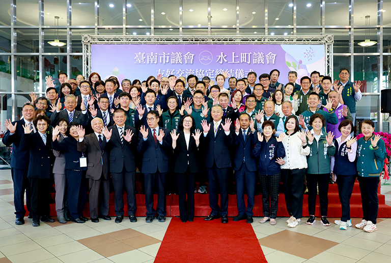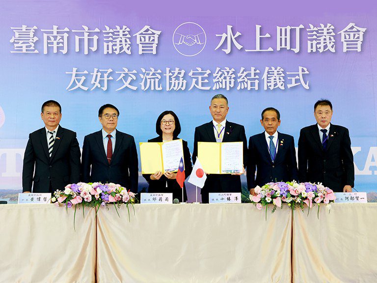 臺南市議會與日本群馬縣水上町議會20日正式簽署友好交流協定,象徵兩地在多年友好互動上邁入更深度的夥伴關係。簽署儀式由臺南市議會議長邱莉莉與水上町議會議長小林洋共同代表議會簽署,黃偉哲市長與水上町町長阿部賢一親臨現場見證,場面隆重而溫馨。