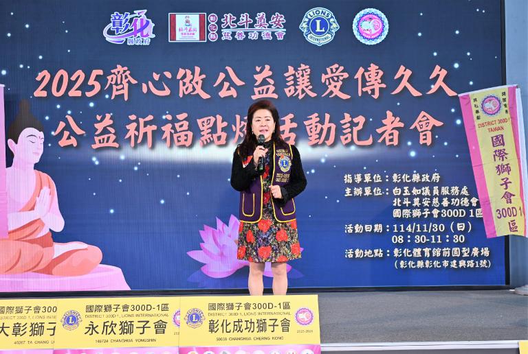 ▲國際獅子會300D1區總監蔡沼玲表示,這是在彰化縣首次舉辦祈福點燈活動,結餘款將全數捐給弱勢單位,造福更多院生,集結獅友的小愛變成大愛,發揮獅子會無私奉獻、基層服務的精神。(圖╱記者孔亮云翻攝)