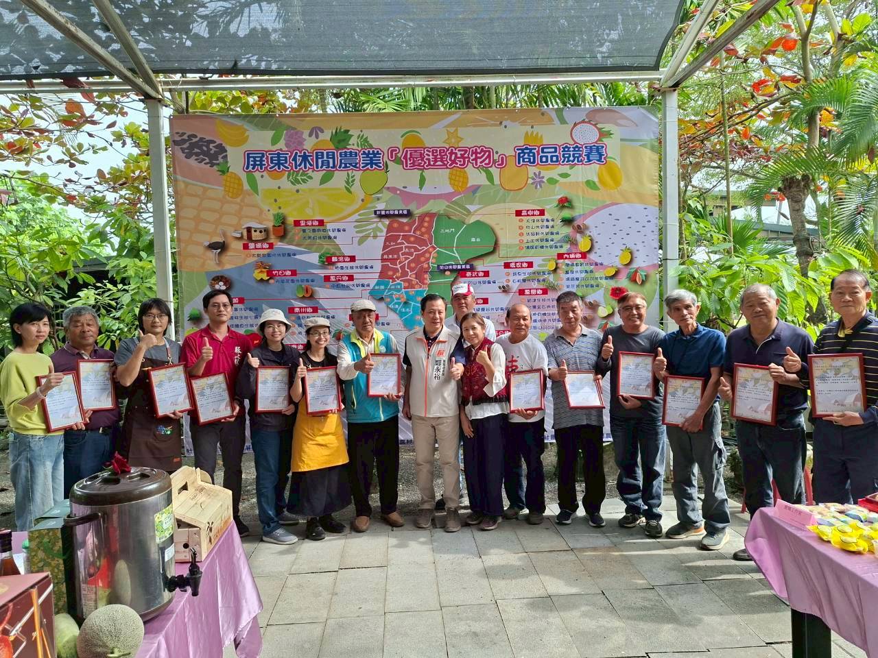 主辦單位特別於東港福灣莊園休閒農場進行授證,其中獲特等獎計12家分別蘭欣辣汗花果休閒農場-禮盒裝二入/墨西哥開胃蔭椒,200g/瓶、朝天辣椒醬,200g、禮盒裝三入/鳳蔭辣椒醬、愛吻辣拌醬、蟹黃蝦麻辣醬,200g/瓶,鴻旗有機休閒農場-鳳梨酵素1入/500cc、稻鴨米1入/1kg、鳳梨醬禮盒裝二入,320cc/瓶,武山老棠農園-禮盒裝/卓安南芒果乾,150g/包、中原世紀休閒農場-青木瓜酵素1入/500cc,佳晶蜂蜜-龍眼蜜700g/盒/瓶、龍眼蜜禮盒裝二入/250g/瓶,不一樣鱷魚休閒農場-黃金果酵素1入/600ml/瓶,新丁有機咖啡農園-咖啡豆/285g/盒,台灣金石咖啡休閒農場-金包裝咖啡豆/ 227g/包,大花玫瑰休閒農場-玫瑰盒子系列玫瑰花醬,220g/瓶、有機玫瑰精露120ml/瓶,屏東縣車城鄉四重溪休閒農業區-温泉Q米,1kg/包,豚之林休閒農場-脆皮烤乳豬,隻/盒,福灣莊園休閒農場-南島四季禮盒(巧克力),6小盒/盒裝,玩果農園-蓮霧乾,60g/包。榮獲優等獎的計12家分別蘭欣辣汗花果休閒農場-米麴沾醬(豆瓣蘋果)250g/瓶、上庄休閒農場-禮盒裝/二入/茶樹精油、台灣肉桂露,500CC/瓶、鴻旗有機休閒農場-香椿茶飲1入,15入/盒、鳳梨乾1入,120g/包、稻鴨米1入,1kg/包、香椿醬禮盒裝/二入,320cc/瓶、中原世紀休閒農場-青木瓜素肉燥(2小包)/600g、青木瓜酵素片,600g/罐、囍羊羊牧場-羊乳片100g/125片/罐、羊奶手工皂,100g/塊、台灣金石咖啡休閒農場-黑包装咖啡豆/ 227g/包、紅包裝咖啡豆, 227g/包、金石小女孩濾泡式,6小包/盒、金石棕色盒濾泡式,10小包/盒、大花玫瑰休閒農場-玫瑰盒子系列乾燥玫瑰花瓣,26g/瓶、玫瑰液態皂/400 ml/瓶、大武山休閒農場-紅藜香草茶包,10小包/包、山苦瓜茶包,10小包/包、慶輝工作室-檸檬酥、檸檬蛋糕、檸檬夾心餅、屏東縣車城鄉四重溪休閒農業區-乾燥雨來菇、牛杙仔(蘿蔔乾) 、 豆仔乾、芒果乾、红龍果乾、芭樂乾、泉蜂了蜂蜜350g、黑豆養生茶禮包(5入) 、 可以喝酒(300ML) 、落山風蔥頭意麵(8包裝) 、黑豆鼓辣椒醬、潘氏農場-温泉皮蛋、潘氏農場-温泉鹹蛋、豚之林休閒農場-富田樹葡萄綜合發酵液,600ml/瓶、富田樹葡萄綜合發酵液,禮盒,60ml/瓶/10入、玩果農園-芒果乾、芭樂乾、鳳梨乾、情人果乾等。以上獲獎的農產品皆由休閒農業區、休閒農場、農民所種植的優質農作物,以負責任的生產態度、「友善環境」以及食安保障可追溯的來源。希望民眾以實際購買行動支持為食安堅持的農友,購買管道請洽社團法人屏東縣休閒農業發展協會網https://www.pingtungfarm.org.tw/index.html