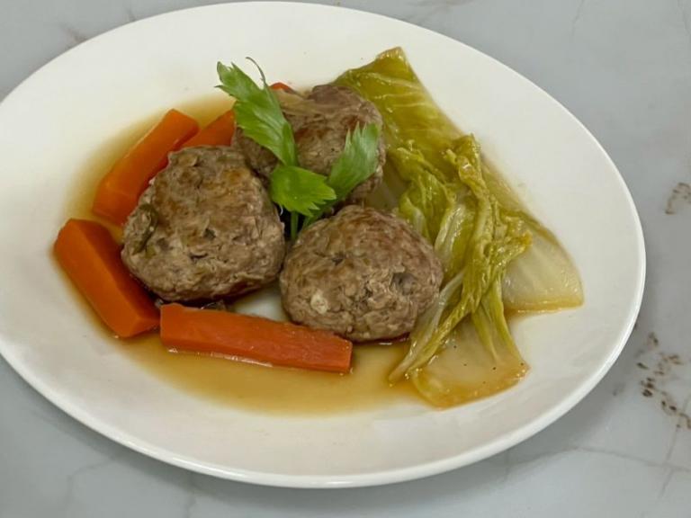 ▲質地調整後紅燒獅子頭。(圖/記者蔣彤雲攝)