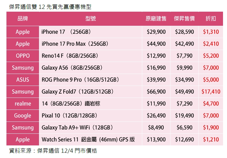 傑昇通信祭出雙12年末促銷,首先是蘋果iPhone大降價,iPhone 17(256GB),原價2萬9900元,結帳現折1310元;入手頂規的iPhone 17 Pro Max(256GB)還能再依定價便宜2410元。