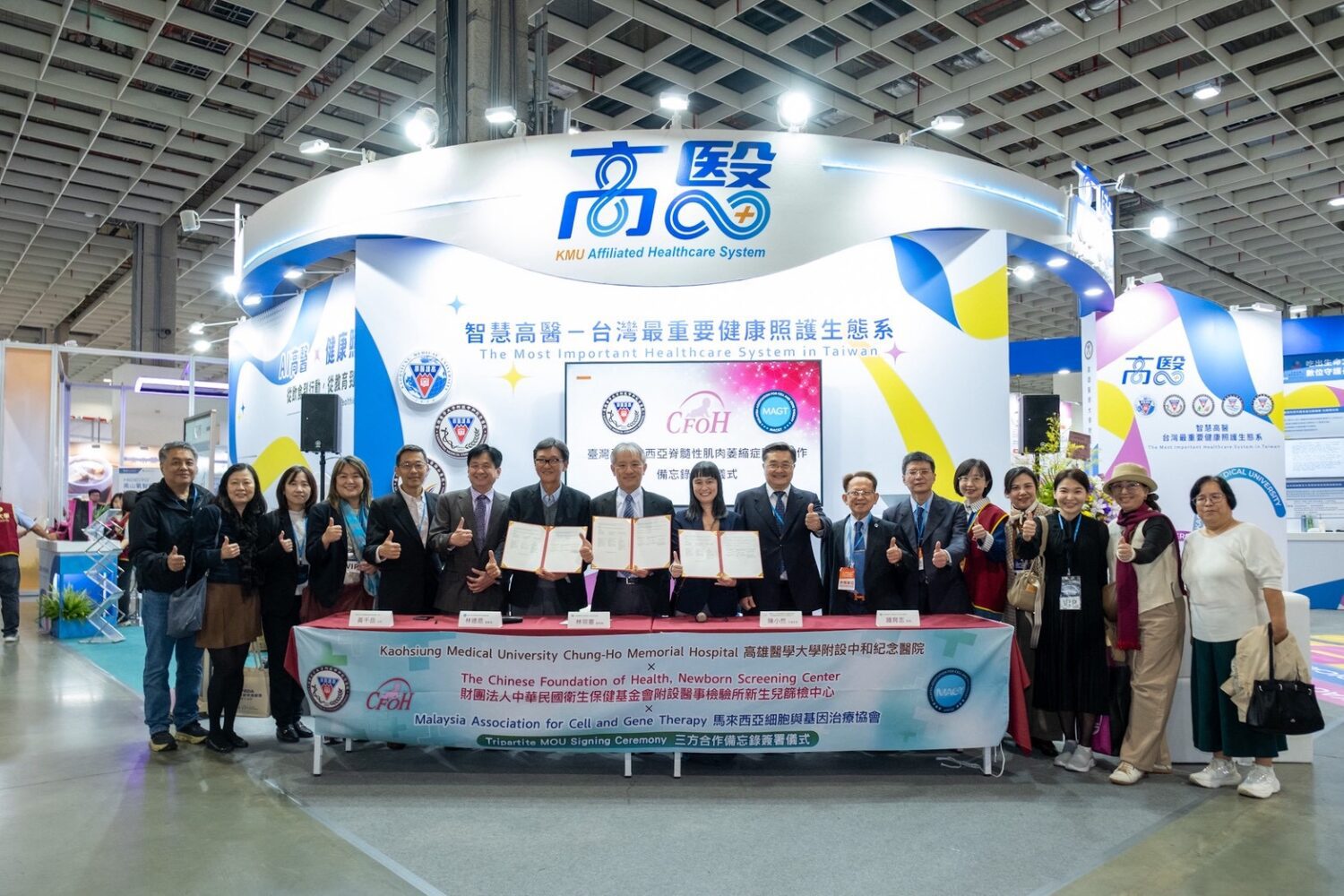 【今傳媒/記者李祖東報導】高雄醫學大學附設中和紀念醫院(以下簡稱高醫)在今年醫療科技展期間,由林宗憲副院長率領鐘育志教授脊髓性肌肉萎縮症(SMA)團隊,與財團法人中華民國衛生保健基金會附設醫事檢驗所新生兒篩檢中心及馬來西亞細胞與基因治療協會(MACGT)共同簽署合作備忘錄,宣示三方將攜手推動SMA臨床與新生兒篩檢合作,立足臺灣、走向全球,展現「臺灣隊」醫療軟實力。本次簽約在經濟部生技醫藥產業發展推動小組(BPIPO)全力支持促成三方合作,為跨國精準醫療合作奠定基礎。