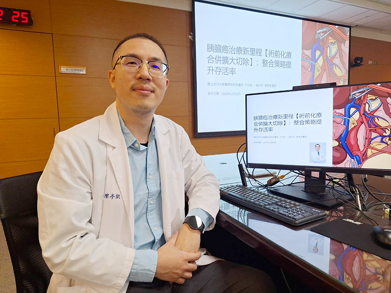 成大醫院一般外科廖亭凱醫師指出,胰臟癌是極具挑戰性的惡性腫瘤之一,多數病人確診時已屬局部晚期或轉移期,無法直接手術。在沈延盛教授領導下,成大團隊積極導入「術前化療」結合「擴大切除」的整合治療策略,讓原本無法手術的病人有更多機會,也明顯延長整體存活期。
