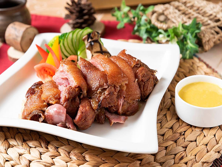 料理選用在地國產豬肉與農特產做為食材,請總舖師搭配出美味豬肉料理,共有諸事鴻圖五福臨、書閣鸞鳳煨魚翅、蒜味白肉海草蝦、港式奇珍龍虎班、培根粽情八寶飯、山中嫩筍轟層肉、田園窯烤龍鳳腿、霜醬德國脆魯足、罈香豬崽一窩樂、尊爵席悅仙草凍等10道菜色。每桌優惠價4,000元、限量40桌,額滿為止。