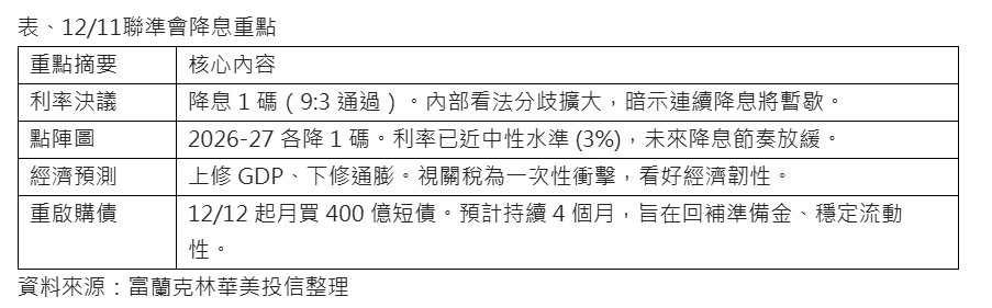 她特別指出,隨著美國政府停擺結束,經濟數據陸續公布,加上AI產業獲利轉換不如預期,市場情緒自高點回落,資金正重新評估風險資產部位。進入12月份,美債殖利率雖短線震盪,但在最新降息與恢復購債政策公布後,利率上行壓力明顯緩解。