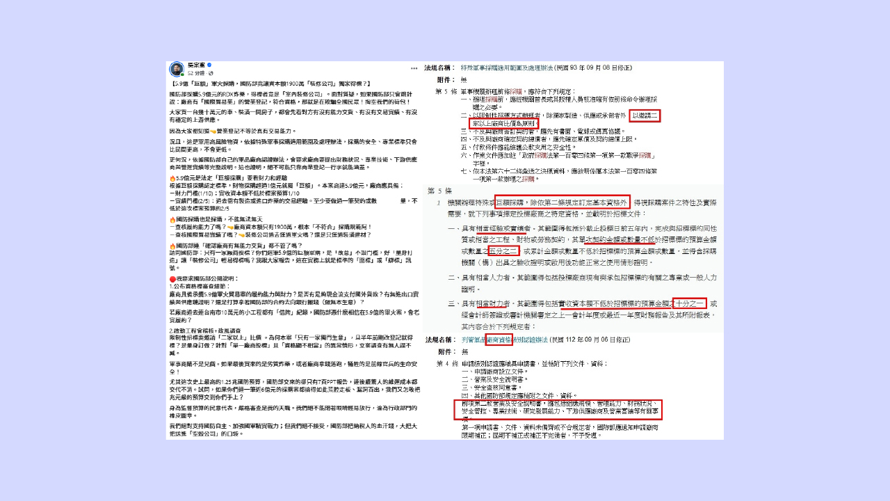 吳宗憲質疑,這筆5.9億軍購案只有一家廠商投標,且該廠商半年前才剛改登記就得標,「這在實務上就是標準的圍標或綁標訊號」。他更提醒,若廠商過去連台南市10萬元小工程都有「借牌」紀錄,國防部憑什麼相信在5.9億軍火案會老實履約?