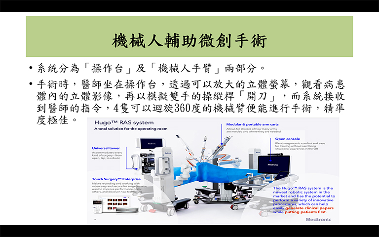 如同AI及機器人是人類未來的趨勢,機器人輔助微創手術也是目前以及未來的手術趨勢。雨果機器人輔助微創手術系統 Hugo™ RAS (Robotic Assisted Surgery System)於2023年首度引進台灣,是國內繼2004年引進達文西手術以來,最新最先進的機器人輔助微創手術系統。