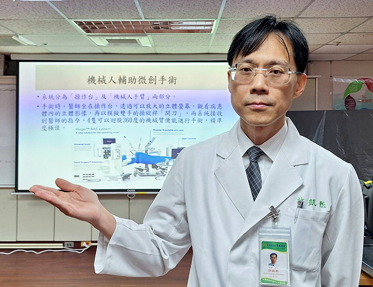 衛生福利部臺南醫院外科主任許凱熙表示,大腸直腸癌是國內最常見的癌症之一,定期接受糞便潛血反應篩檢,可及早發現大腸直腸癌加以及時治療。大腸直腸癌的治療以手術為主,由最早期傳統剖腹手術,到腹腔鏡微創手術,再演進到最先進的機器人輔助微創手術。