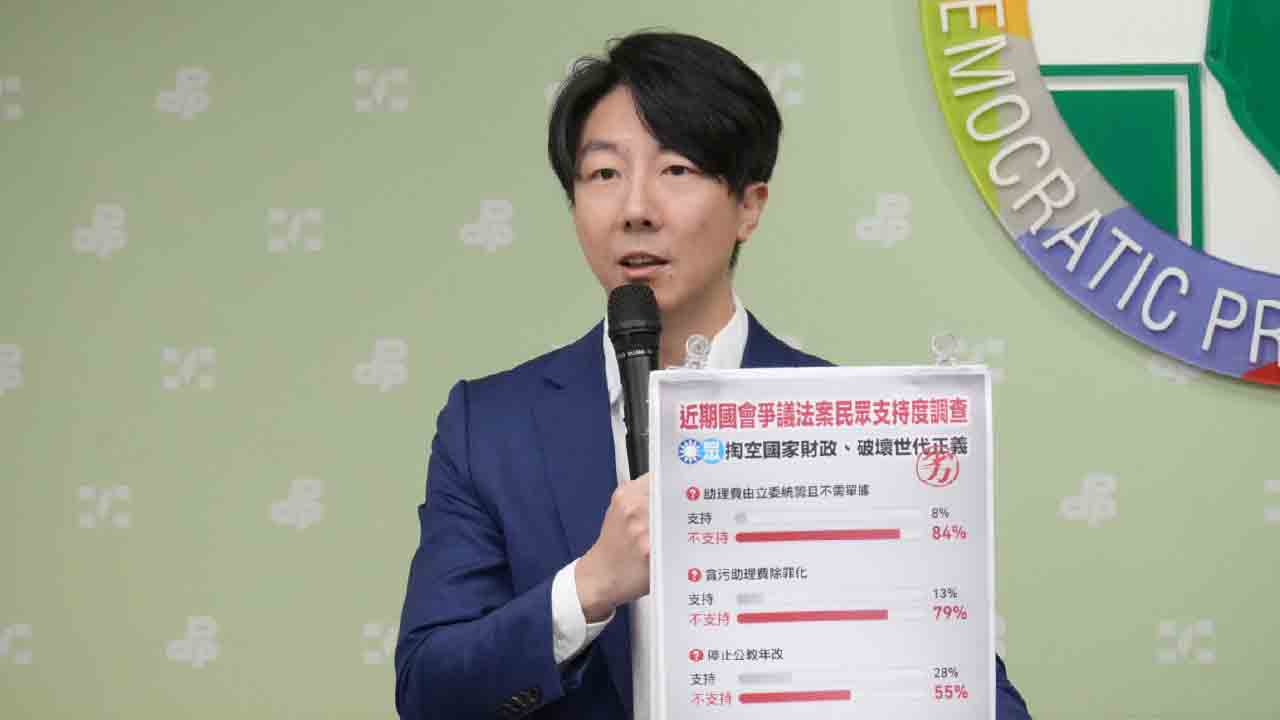 民進黨今(12)日公布最新民調,顯示立法院藍白立委近期推動的多項爭議法案均遭高比例民眾反對。民進黨發言人吳崢、韓瑩召開記者會指出,藍白接連提出法案不僅多案逕付二讀、甚至強行三讀,已對國家安全、社會安定及財政永續造成衝擊,呼籲在野黨尊重民意、懸崖勒馬。