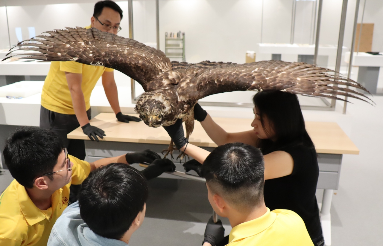 中市圖「世界的索引」,展出奇美博物館「鳳頭蒼鷹標本」館方(右)協助佈展