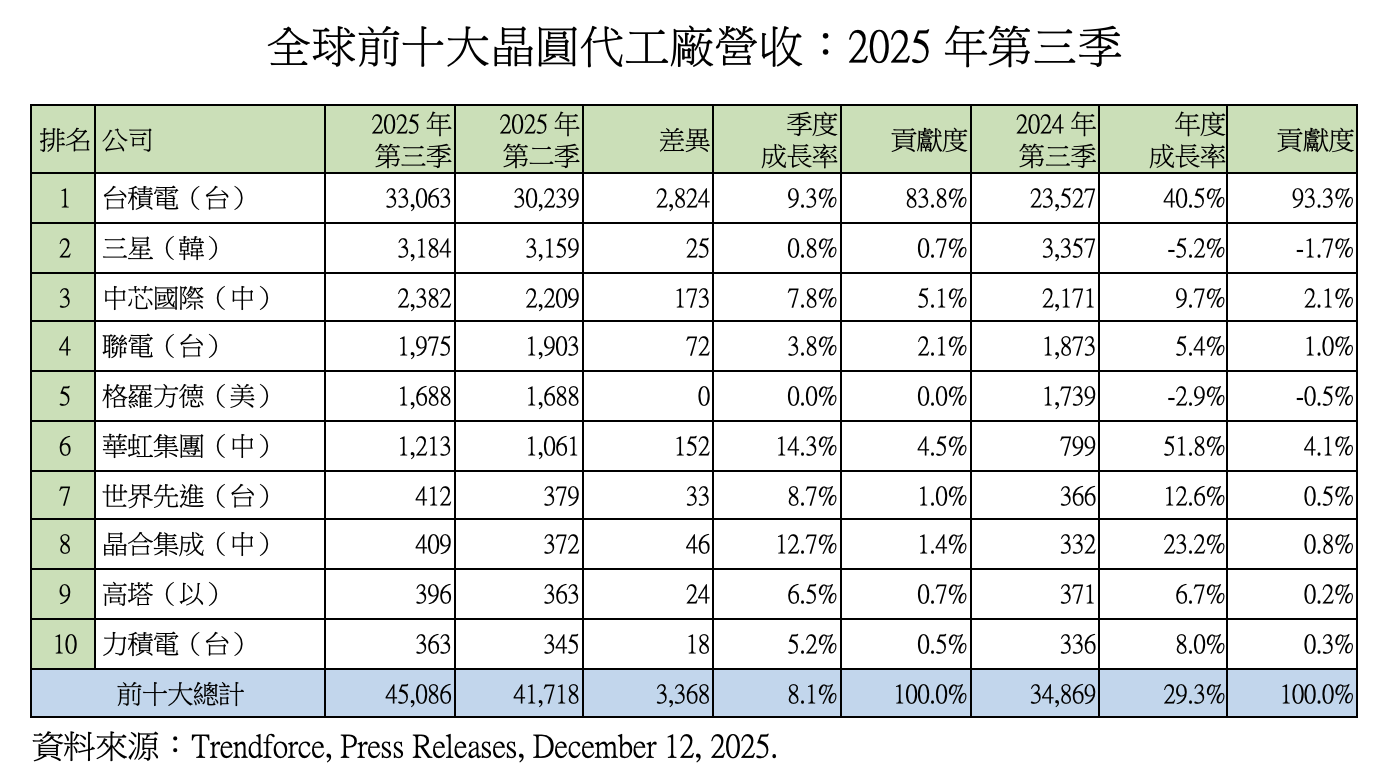 若以季度貢獻度觀察,前十大晶圓代工廠於 2025 年第三季合計營收較前一季增加 33.7 億美元,其中台積電貢獻約 83.8%,顯示本季產業新增動能主要集中於台積電單一業者。