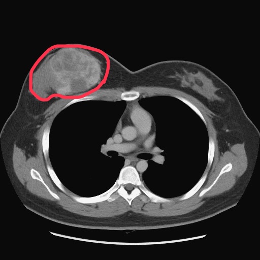 ▲電腦斷層影像可見陳小姐右乳房的葉狀瘤(紅圈處)。(圖╱臺中榮總提供)