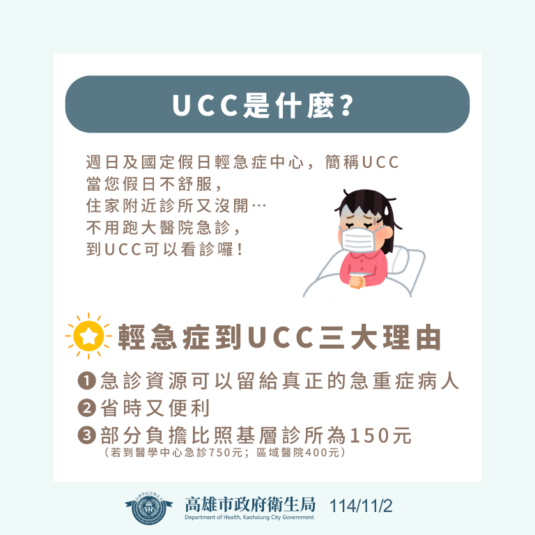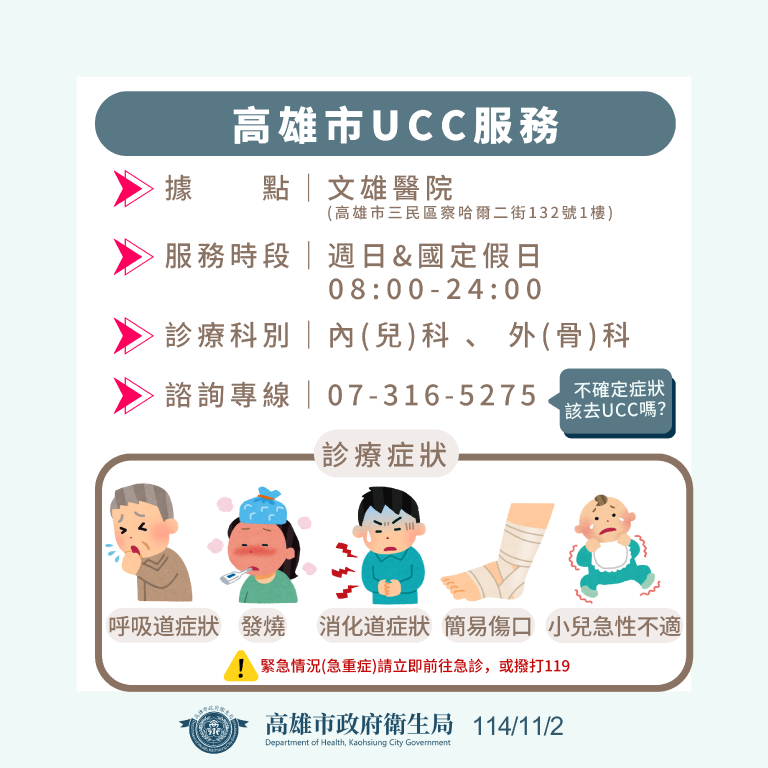 為因應民眾在週日或國定假日診所休診時的就診需求,及提昇醫療韌性、因應疫情及突發公共衛生事件,衛生福利部中央健康保險署(下稱健保署)今(114)年11月起推動「全民健康保險週日及國定假日輕急症中心(Urgent Care Center, UCC)試辦計畫」,其中高雄市政府衛生局協助三民區文雄醫院設置全市首家試辦醫院,截至12月15日服務95位患者,其中以內科53人居多,有效分流輕症病患,紓解大型醫院急診壅塞。