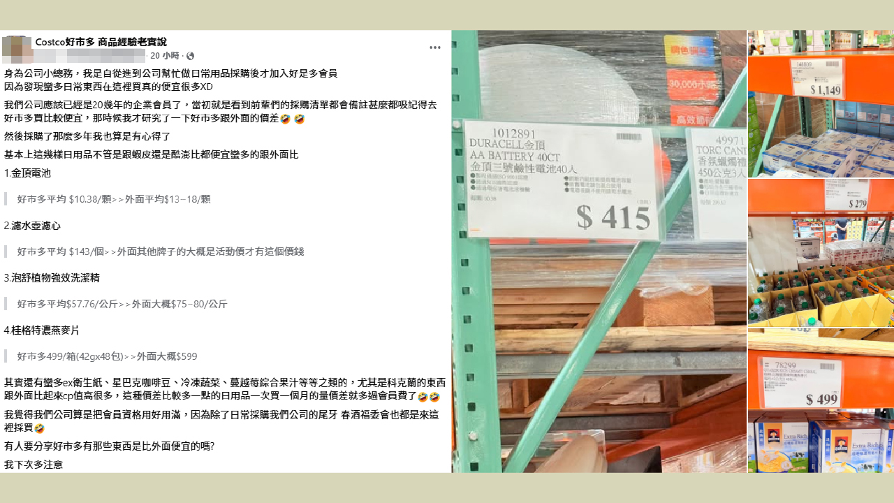 隨著物價持續走高,消費者對價格敏感度提升,連鎖量販通路好市多(Costco)再度成為討論焦點。有網友在臉書社團「Costco好市多 商品經驗老實說」分享,身為公司總務,長年負責日用品與活動採購,實際比價後發現,多項日用品在好市多購入,價格明顯低於其他通路,累積下來的價差甚至「一個月就超過會員費」。