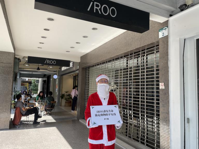 聖誕節前夕,國際動物保護組織 PETA(善待動物組織)於18日上午在高雄市苓雅區發起街頭行動,一名裝扮成聖誕老人的 PETA 支持者,將現身連鎖服飾門市外,公開譴責販售以兔子與狐狸毛皮製成的帽子、圍巾等商品,呼籲業者立即停止使用動物皮草。