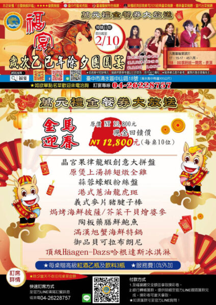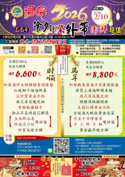 (焦點時報/總社長孫崇文、記者鄒志中報導)  「金馬騰躍迎新歲!福宴創意美食夯!」、「馬躍新春!饗宴滿堂!」想像一下,當金馬奔騰的喜慶號角響徹天際,農曆丙午馬年以無比活力闖入您的生活!臺中清水區的美食傳奇「福宴國際創意美食」(Full Yuan International Cuisine Fresh Seafood Restaurant)在此刻華麗蛻變,推出震撼人心的2026年農曆新年圍爐專案「馬躍新春 饗宴滿堂」。這場如煙火般璀璨的饗宴,將於2026年2月10日(農曆正月初一)爆發無限魅力,融合古老中華美食的魂魄與前衛創意的火花,為每位賓客獻上一場震撼五感的狂歡派對!無論是溫馨家庭圍爐、熱鬧企業尾牙,還是好友狂歡聚會,福宴國際創意美食精心打造的多款夢幻套餐,從NT$6,000元起飛直衝NT$13,800元,每桌10位賓客,服務費僅加10%,讓您在金碧輝煌的殿堂中,盡情沐浴海鮮的鮮美浪潮與節慶的熾熱激情!