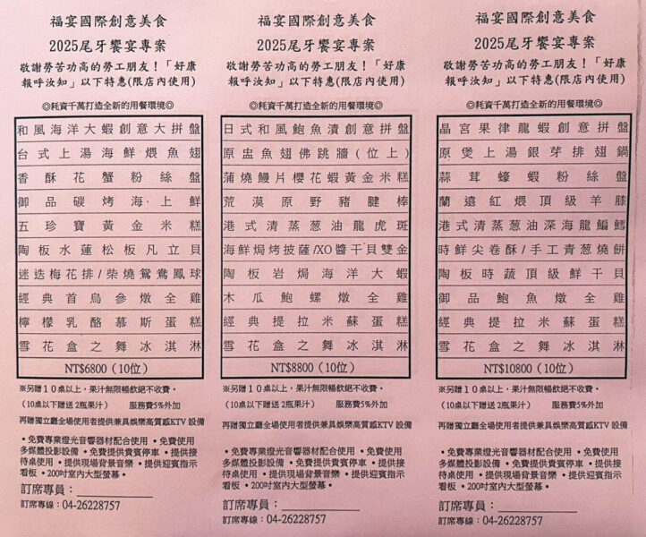 回溯福宴國際創意美食的輝煌傳奇,這座清水區的美食堡壘不僅是臺中的驕傲,更是海鮮創意的聖殿!從2007年擴張起,便成為婚宴、尾牙、壽宴的夢幻舞台,其宮廷式裝潢如穿越時空的華麗冒險,現代燈光藝術點亮每場盛會。過去的中秋烤肉狂歡或端午粽子派對,皆如星光般閃耀,此次馬年促銷預計引爆300桌以上的熱潮!負責人激情宣言:「讓我們在馬年的奔騰中,點燃味蕾的火花,織就永恆的團圓記憶!」