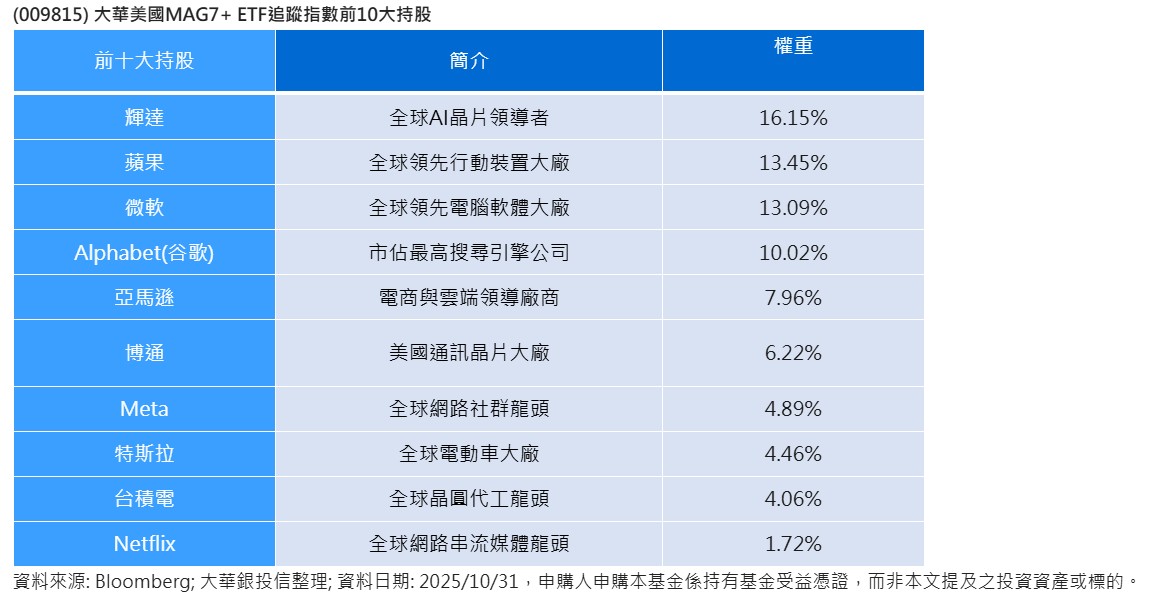 大華銀投信將於明年元月募集台灣首檔聚焦七大科技巨頭的全球科技股ETF:大華銀Magnificent 7 Plus美國大型科技ETF (009815,簡稱:大華美國MAG7+),70%權重鎖定科技七巨頭(Magnificent 7),再搭配23檔全球頂尖科技企業,其中包括台積電,訴求打造能夠「100%受惠AI趨勢」的投資組合。