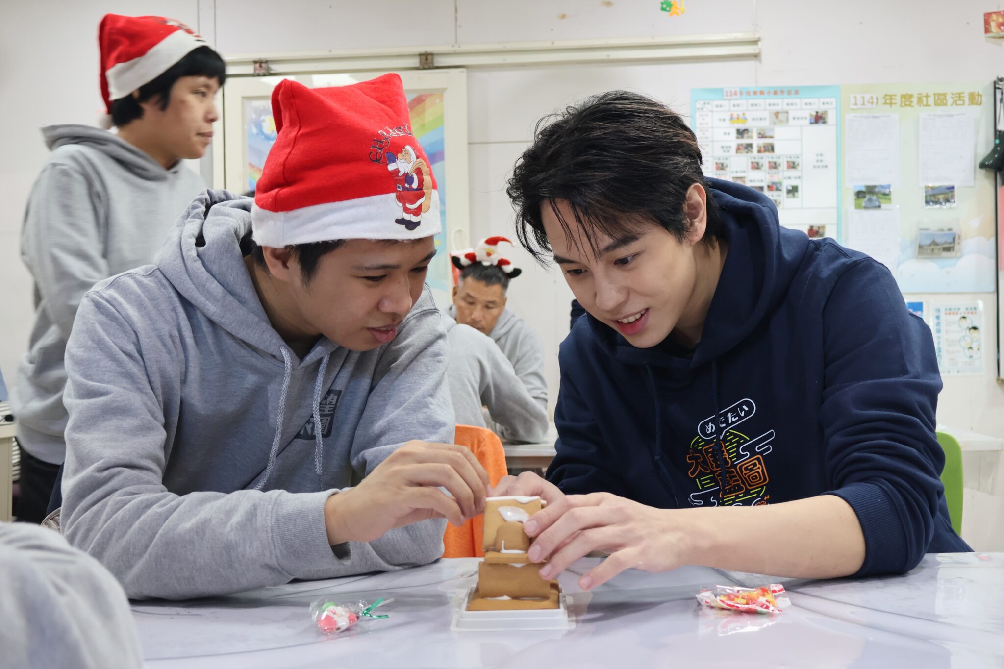 除了用音樂互動,MAI孫麥傑更與憨兒們組隊一起動手製作薑餅屋,從拼裝到裝飾全程耐心陪伴的過程笑聲不斷,孫麥傑更從中感受到與憨兒共處時的暖心問候,「在做薑餅屋的時候,有一位憨兒主動關心我有沒有吃早餐,那個眼神很純粹,也感受到他的溫暖,反倒療癒了我的心靈。」除此之外,熱心做公益的MAI孫麥傑還貼心準備披薩與憨兒們開起美食派對,並穿上基金會推廣的公益年菜 T 與孩子們同樂,原本準備捐出五萬元加菜金的他,在得知基金會同時推動「送愛到偏鄉」關懷物資箱計畫後深受感動,現場還將捐款提高至十萬元,希望在歲末為憨兒與弱勢家庭送上一份實質支持,也盼拋磚引玉,邀請更多人一同響應,為這場溫馨的聖誕活動增添更加暖意及愛心的同時,真善美社會福利基金會更以贈與感謝狀答謝孫麥傑以實際行動為憨兒們帶來溫暖且不一樣的聖誕節,讓愛與幸福在節日中持續傳遞。