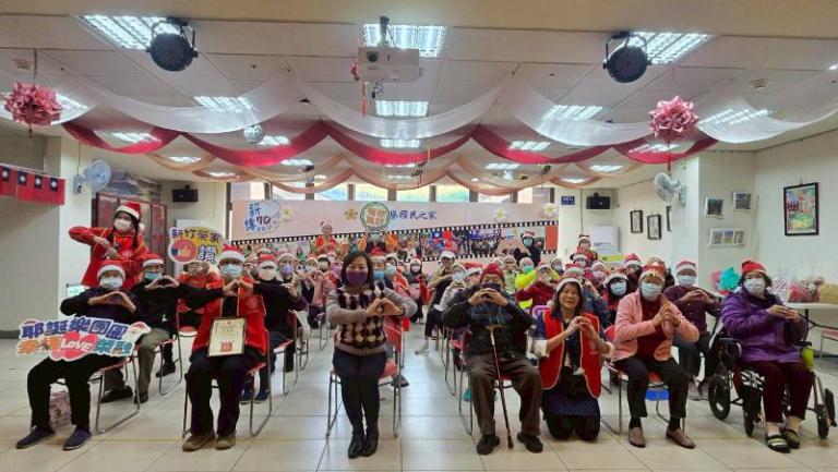 ▲聖誕報佳音活動在文康大廳溫馨展開,白恩惠主任(左3)與長輩以愛心手勢傳達幸福與歡樂氣氛。(圖/記者蔣彤雲攝)
