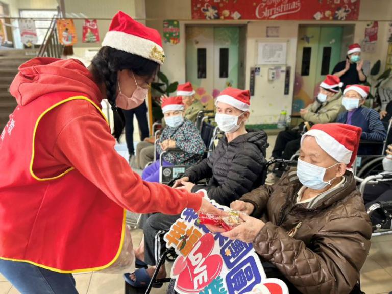▲志工親手將聖誕小禮物送到長輩手中,貼心問候與祝福。(圖/記者蔣彤雲攝) ‘