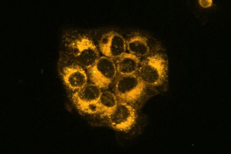 ▲在倒立螢光顯微鏡下,能清楚看見癌細胞脂質的氧化壓力、確認鐵死亡狀況。 (圖/記者蔣彤雲攝)