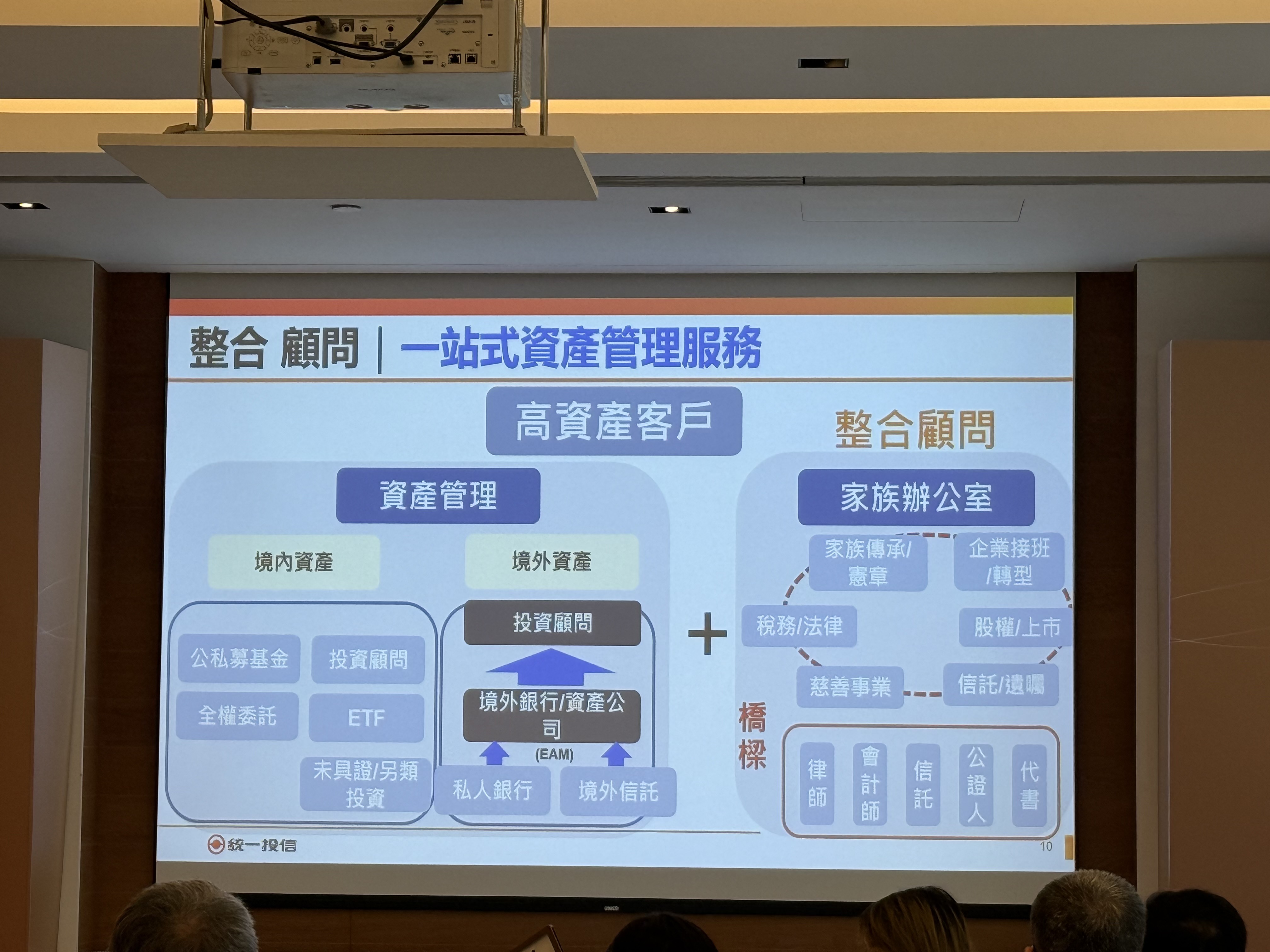 相較過往台灣缺乏正式家族辦公室法令,高資產客戶多將家族辦公室設立於國外,易衍生諸多問題。統一投信則是依法受金管會多層監理,能提供更高規格的制度保障,同時作為家族辦公室整合顧問業務的專案負責機構,能有效協調如律師、會計師及信託等不同專業,降低家族內部紛爭的處理成本。