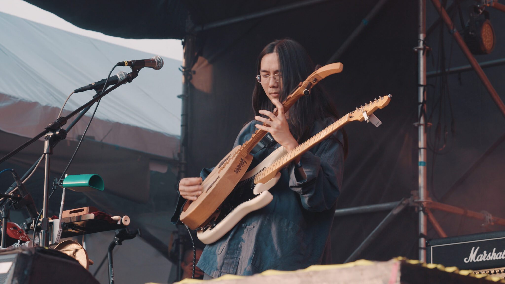 林奕碩常以長柄月琴、電吉手交替演奏。圖片提供:公視