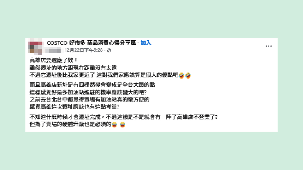 除了賣場空間擴大,討論熱度最高的莫過於「附設加油站」。由於目前高雄店缺乏此機能,不少南台灣會員相當羨慕台北與台中的配置,紛紛許願:「希望遷址後能順便加油,真的會方便很多!」 儘管官方尚未正式宣布加油站的營運細節,但外界多分析腹地擴大將是加油站進駐的絕佳契機。