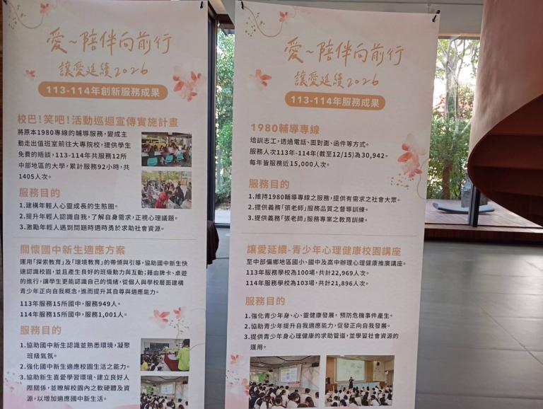 張麗莉主委強調,預防重於治療,「張老師」將持續透過1980安心專線、校園講座及多元心理健康服務,成為青少年與家庭最溫暖且堅實的後盾,衷心希望在生命中多放入一些愛,從幼小的幼苗開始培養他們堅強的心智。活動中並致贈《青春攻略》予台中市教育局,象徵公私協力共同守護青少年心理健康的決心。教育局代表劉黛麗督學及江佳鍹專員也於現場表示:「孩子在學校不只學習知識,更需要愛與陪伴。感謝「張老師」持續為教育第一現場提供很好的輔導資源。」期盼結合政府、校園與地方單位的力量,共同為青少年的心理健康努力,讓愛持續延續。