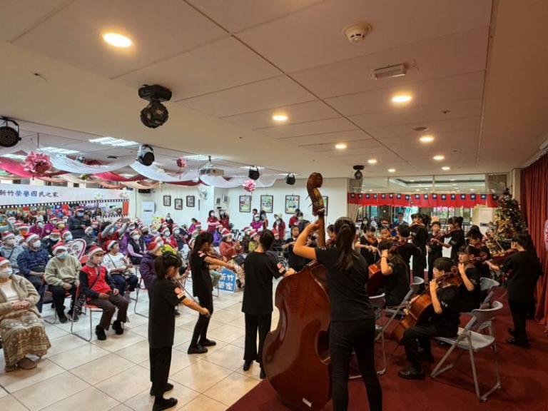 十興國小弦樂團小小演奏者們以紮實技巧與真摯情感,帶來經典聖誕及流行樂曲,營造充滿節慶的歡樂氛圍,長輩們專注聆聽、輕聲和唱,沉浸在溫馨旋律,感受節慶的美好記憶。新竹荷蘭國際學校學生亦以精采的豎琴加入演奏與長輩互動,學子們用青春能量展現多元文化與在地關懷的力量,現場長輩們露出燦爛笑容,溫阿姨笑著說:「今年的聖誕節特別熱闹,也特別幸福。」