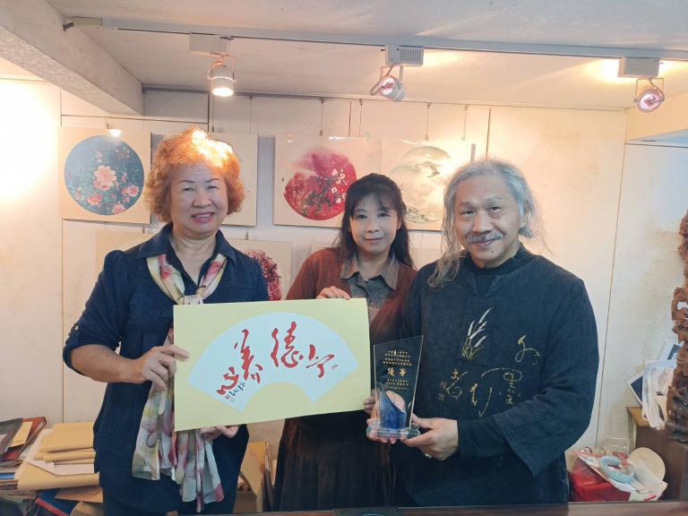 ▲何木火大師並發揮愛心,捐贈藝術杯墊給「動物保護防疫獎勵評鑑」優等獎的台中市希望愛生命關懷協會,理事長王麗嘉(中)代表受贈,未來將義賣並把所得款項全數用於協會經費。(圖╱記者孔亮云翻攝)