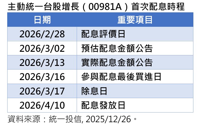 主動統一台股增長(00981A)改為季配息囉!收益分配頻率由原本的年配息改為季配息,除息月份也將改為每年的3、6、9、12月,調整後的首次收益分配時程,預計於明(2026)年3月2日公布預估配息金額、3月13日公布實際配息金額,並於3月17日除息。